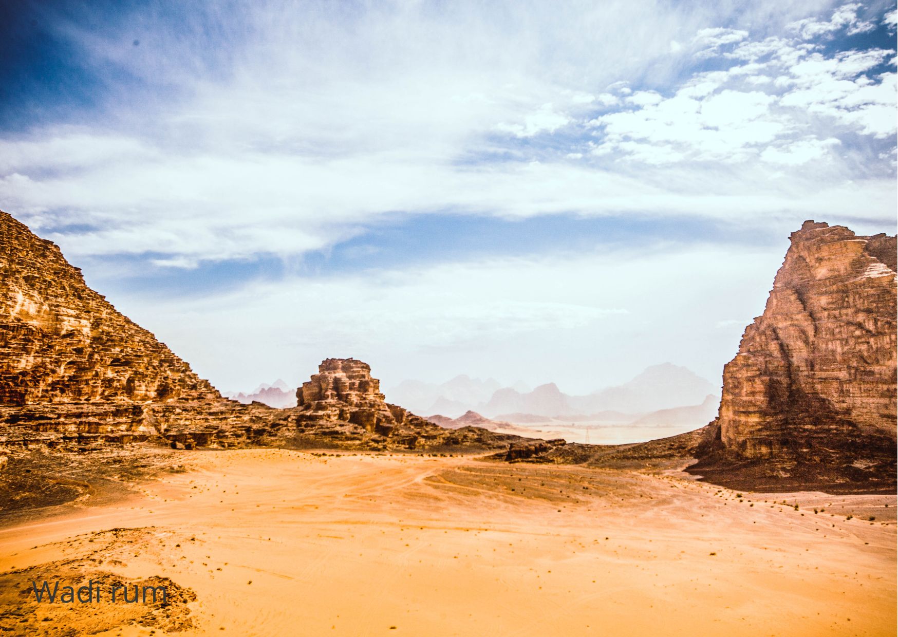 Een overweldigend mooi woestijn gebied waar een kleuren harmonie van bergen zand , graniet en zandsteen een groot schilderij vormen. Ook wel de ‘vallei van de maan ”genoemd. Leuk is om een tour te doen in een 4x4 auto. Ontdek de 12.000 jaar oude rotsgravures, bewonder de roze en gouden bergen, canyons en valleien. De wadi rum staat ook op de UNESCO wereld erfgoed lijst. Neem een overnachting in een bedoeïenentent, en geniet van de ondergaande zon tijdens een traditioneel diner. S ’avonds geniet je van een kampvuur me een prachtige sterren hemel.
